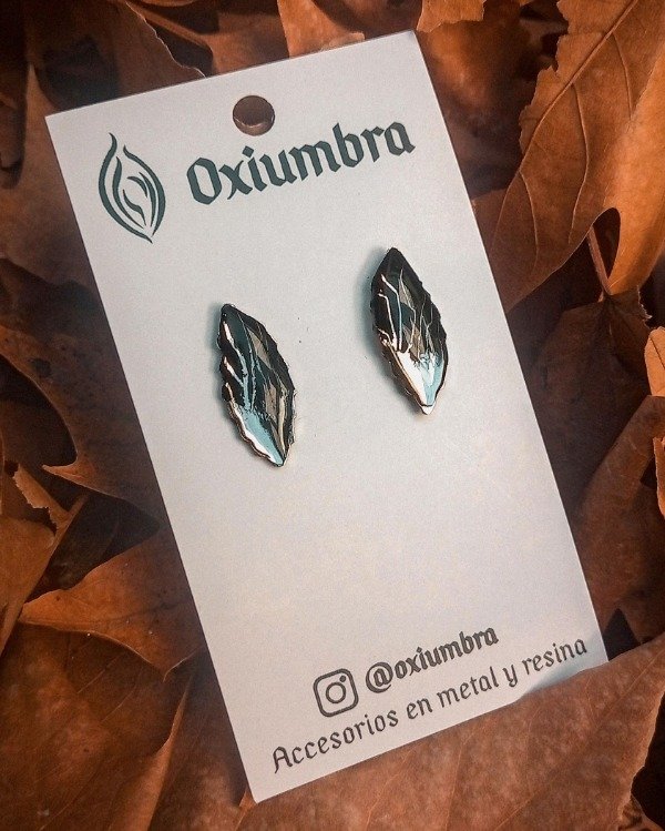 Dijes de alpaca patinados con pigmentos acuarela cubiertos en resina.